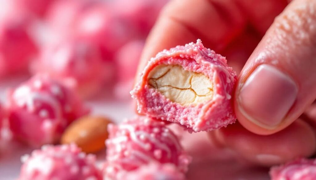 Le praline rosa di Lione — dette in francese pralines roses — sono mandorle intere rivestite di uno strato spesso e croccante di zucchero cotto colorato di rosa. Niente aromi artificiali predominanti, nessuna farcitura: solo la mandorla, lo zucchero e quel colore che, nei laboratori artigianali più rigorosi, proviene ancora da coloranti naturali o da una lunga tradizione di dosaggi gelosamente custoditi. La texture è quella tipica del confetto duro, con una crosta che si spezza nettamente sotto i denti rivelando il cuore legnoso e oleoso della mandorla tostata.