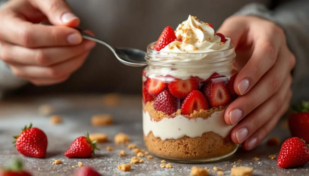 Lavorate con ritmo: la crema al mascarpone è a suo agio solo se non l'aspettate troppo. Distribuite un primo strato di fragole macerate sul fondo di ciascun barattolo, con un po' del loro sciroppo rosso. Aggiungete sopra uno strato generoso di crema al mascarpone, usando un cucchiaio oppure la sac-à-poche con bocchetta a stella per un effetto più scenografico. Alternate un secondo strato di fragole e terminate con un ciuffo di crema. Decorate con una fragola intera, qualche fogliolina di menta fresca e un filo dello sciroppo di macerazione. Chiudete i barattoli con il coperchio a vite — la chiusura ermetica mantiene la crema integra durante il trasporto.