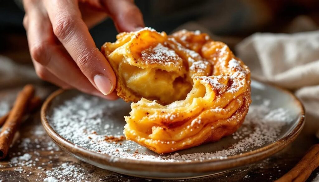 Spolverizzate le frittelle con zucchero a velo abbondante appena prima di servire. Sono migliori tiepide, quando l'interno è ancora morbido e la cannella sprigiona tutto il suo aroma. Disponetele su un piatto da portata o in una ciotola foderata con carta da forno, e accompagnatele con una tazza di tè alle erbe o una cioccolata calda leggera per i più piccoli.