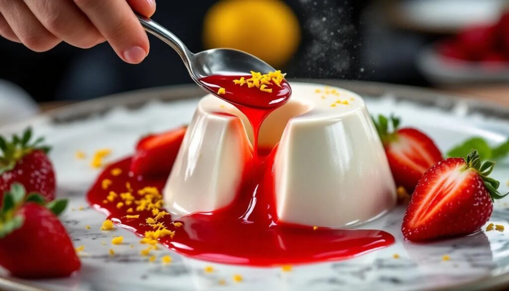 Per sformare, passate la lama di un coltellino sottile lungo il bordo dello stampino per staccare la crema. Rovesciate rapidamente su un piatto da dessert freddo: la panna cotta deve cadere con un suono sordo, quasi un tonfo soffice. Se non si stacca, immergete brevemente la base dello stampino in acqua calda per 5–8 secondi. Versate le fragole macerate con il loro liquido attorno alla panna cotta, non sopra: la presentazione laterale permette di vedere il contrasto cromatico tra il bianco avorio della crema e il rosso intenso delle fragole. Completate con le foglie di menta fresca.