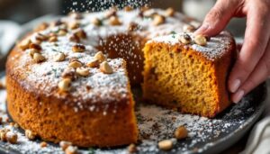 Una volta fredda, capovolgete la torta su un piatto da portata, rimuovete la carta da forno e rigiratela nuovamente. Con un setaccio a maglia fine, cospargete la superficie con uno strato generoso di zucchero a velo. Servitela a temperatura ambiente, tagliata in spicchi con un coltello a lama sottile passato in acqua calda tra un taglio e l'altro, per ottenere fette nette e pulite.